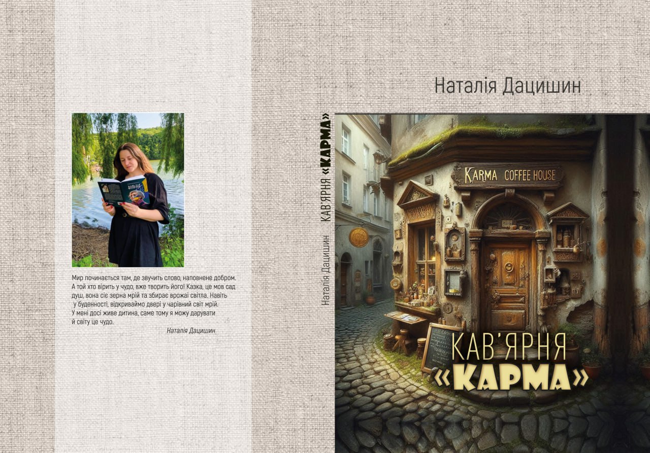 Дацишин_Наталія_Кавярня Карма_обкладинка8 вересня 2025 року. Команда «Бук-Друку» незадовго до книжкового свята ВІНБУКФЕСТУ приготувала малим читачам казковий сюрприз: виходить у світ збірка захоплюючих казок: НАТАЛІЯ ДАЦИШИН «КАВ’ЯРНЯ «КАРМА». Це не просто інтригуючі сюжети, але глибокий філософський, повчально-пізнавальний погляд на життєві явища, який спонукає до роздумів, висновків. Життя і фентезі в книзі тісно переплітаються, породжуючи плин пригод, вражень і думки.