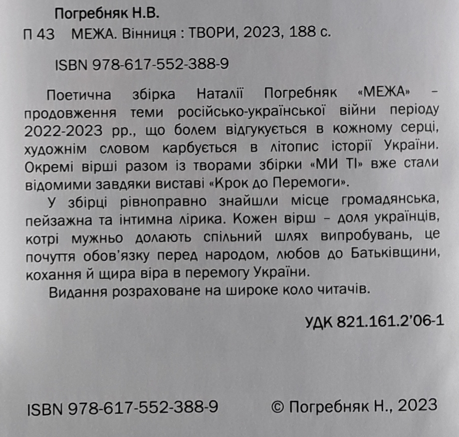 Погребняк Наталія_Межа_2023_обкладинка10 жовтня 2023 року. Побачила світ нова поетична книга НАТАЛІЇ ПОГРЕБНЯК «МЕЖА». В ній високохудожнє осмислення кривавих сторінок героїчної боротьби України проти російської навали ХХІ століття. Авторка глибоко проникає в нову для нас психологію життя в стані війни, золотими нитками вплітаючи в «вишивання чорним по білому» нотки віри, любові і надії…мелодії жіночого кохання і вірності в ньому.