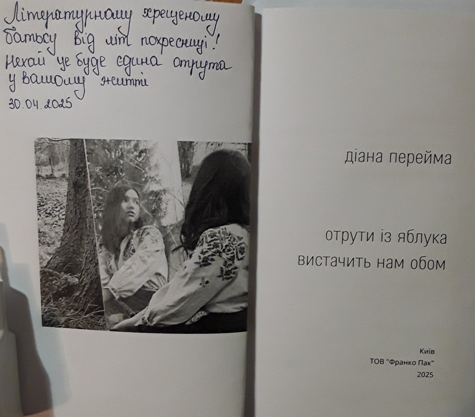1 травня – перший подарунок улюбленого місяця: Нова пошта принесла мені книгу з автографом нашої юної і багатообіцяючої поетеси ДІАНИ ПЕРЕЙМИ «ОТРУТИ ІЗ ЯБЛУКА ВИСТАЧИТЬ НАМ ОБОМ». Попри зворушливий напис, книга ця принесла мені радість від того, що судячи з першого мого її прочитання, наша Діана добилася значного творчого прогресу, виробила оригінальний стиль, розбудувала цікавий, іноді химерний, спокусливий, загадковий світ ілюзій і реалій, з фантастичною феєрією думок, почуттів, передбачень.Вінницька обласна письменницька організація рік тому рекомендувала Діану Перейму на прийом до Національної спілки письменників України і, судячи з усього, нова книга не лише талановитої, але й досить плідної на терені творчості поетеси стане переконливим аргументом у цьому.