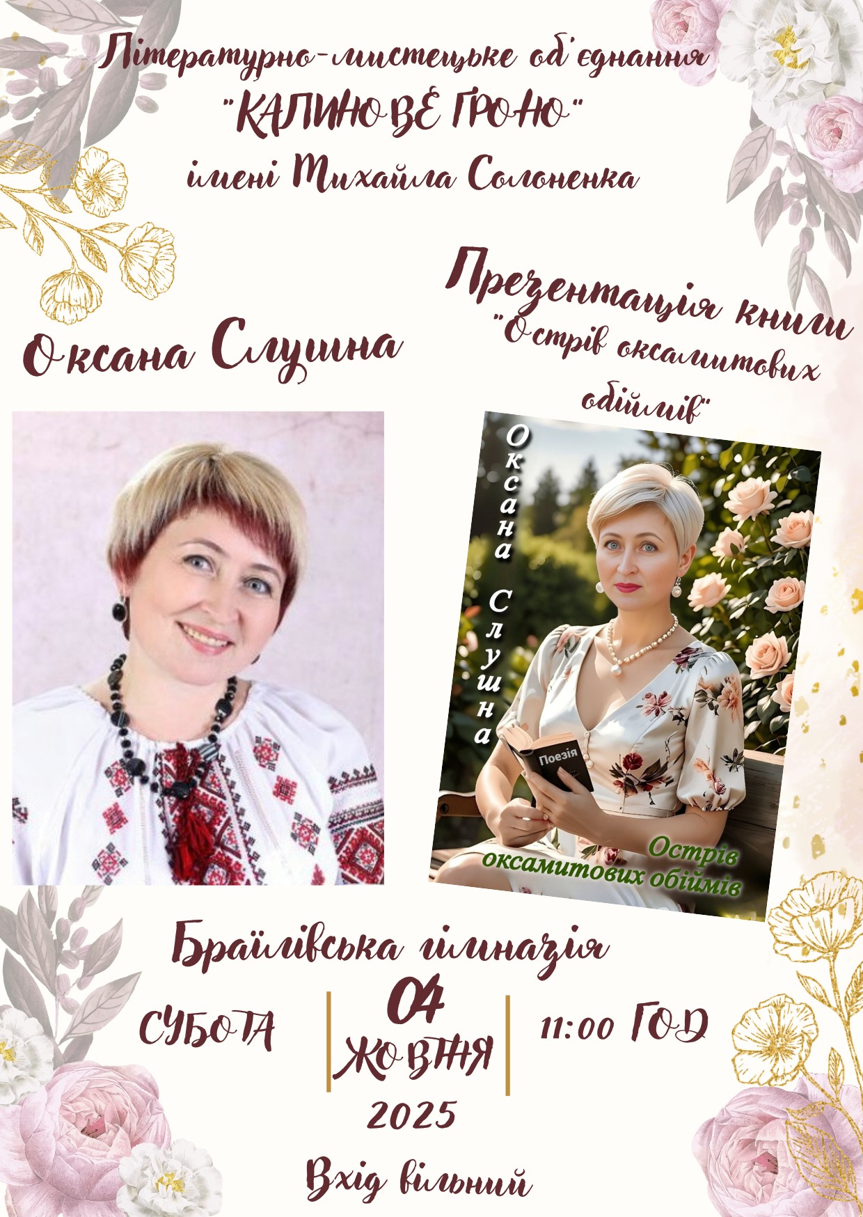 Збірка лірики браїлівчанки ОКСАНИ СЛУШНОЇ «ОСТРІВ ОКСАМИТОВИХ ОБІЙМІВ» таємнича не лише за назвою. Читач і слухач під час її презентації зустрінеться з «Таємничими тавтограмами» першого розділу, ритмомелодикою жіночих дум і почуттів, одкровеннями романтичного серця, мандруватиме землею, серед див природи, і небом – де зорі Щастя і Печалі.