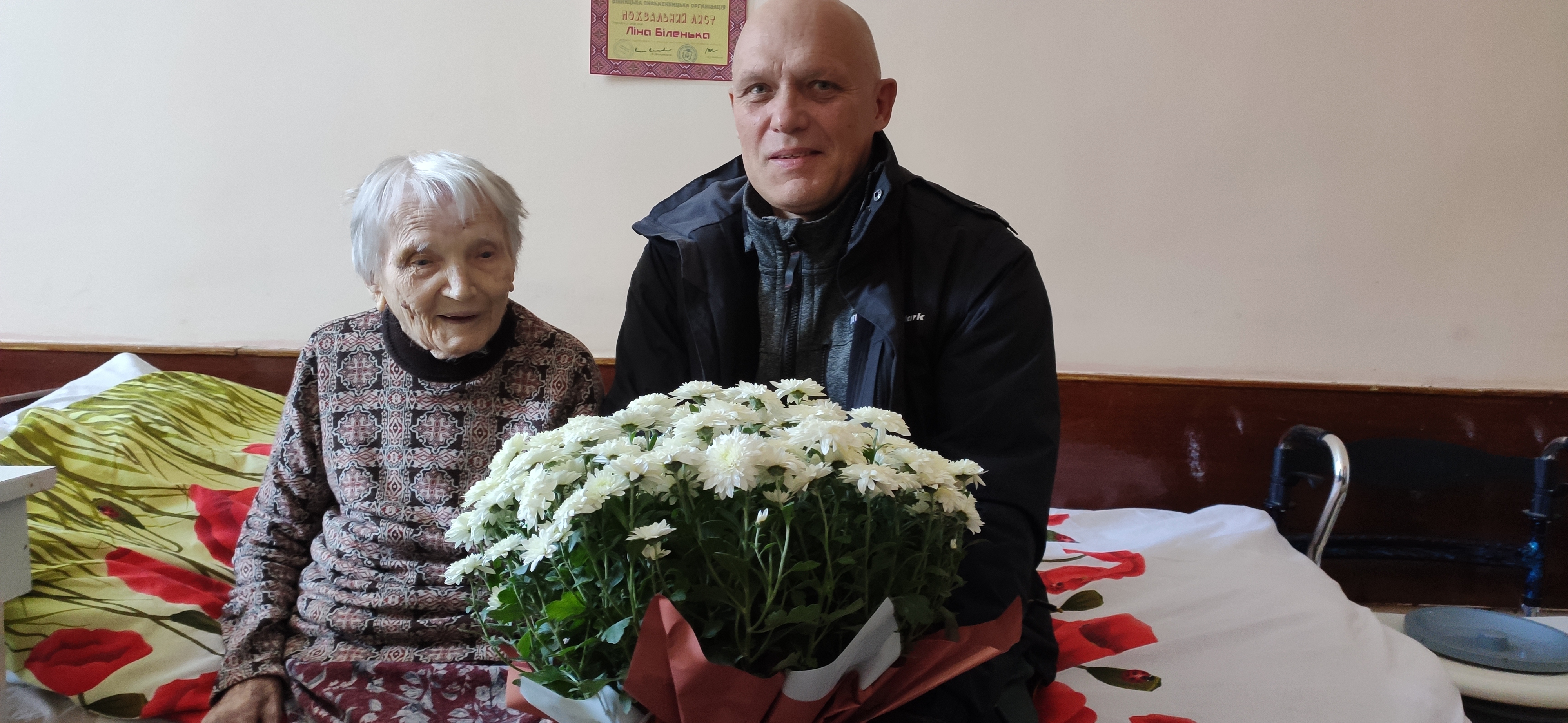 1_IMG_20241106_105259Андрій Стебелєв написав у соціальних мережах: Сторічний ювілей святкує сьогодні наша письменниця-землячка Ліна Біленька. Привітав її у Підбужі на Львівщині. Від вінницьких письменників передав вітальну адресу і оберемок біленьких хризантем. Народилася у Юзвині під Вінницею, у нас вступала до спілчанських лав, тут видала колись деякі зі своїх збірок лірики та книжок для дітей. Поважний вік, шанобливе життя! З ювілеєм, Ангеліно Тимофіївно!