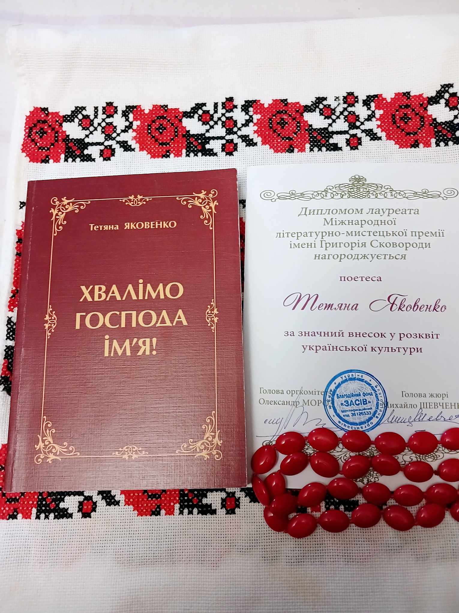 Поетеса Тетяна Яковенко нагороджена у 2024 році Міжнародною літературно-мистецькою премією імені Григорія Сковороди за значний внесок у розквіт української культури. Лауреатство вона здобула за переспіви Святого Письма, зокрема, книгу «Хвалімо Господа ім’я». Лауреатка поділилась своїми враженнями від події у соціальних мережах: «Міжнародна премія імені Григорія СКОВОРОДИ! Яка велика воістину Різдвяна радість! Мій ювілейний 2024 завершується благословенням видатного українського філософа і релігійного мислителя Григорія Сковороди! Во славу Господню, во благо народне! Уклінна вдячність всім, хто оцінив мою більше чим двадцятилітню працю з художнього пізнання Святого Письма як духовного імперативу українців!» Премія заснована Українським фондом культури 1991 року за ініціативи Михайла Шевченка та Тараса Нікітіна у відповідь на розбите вандалами в Чорнухах погруддя Григорія Сковороди. Перші лауреати премії визначені 1992 року.