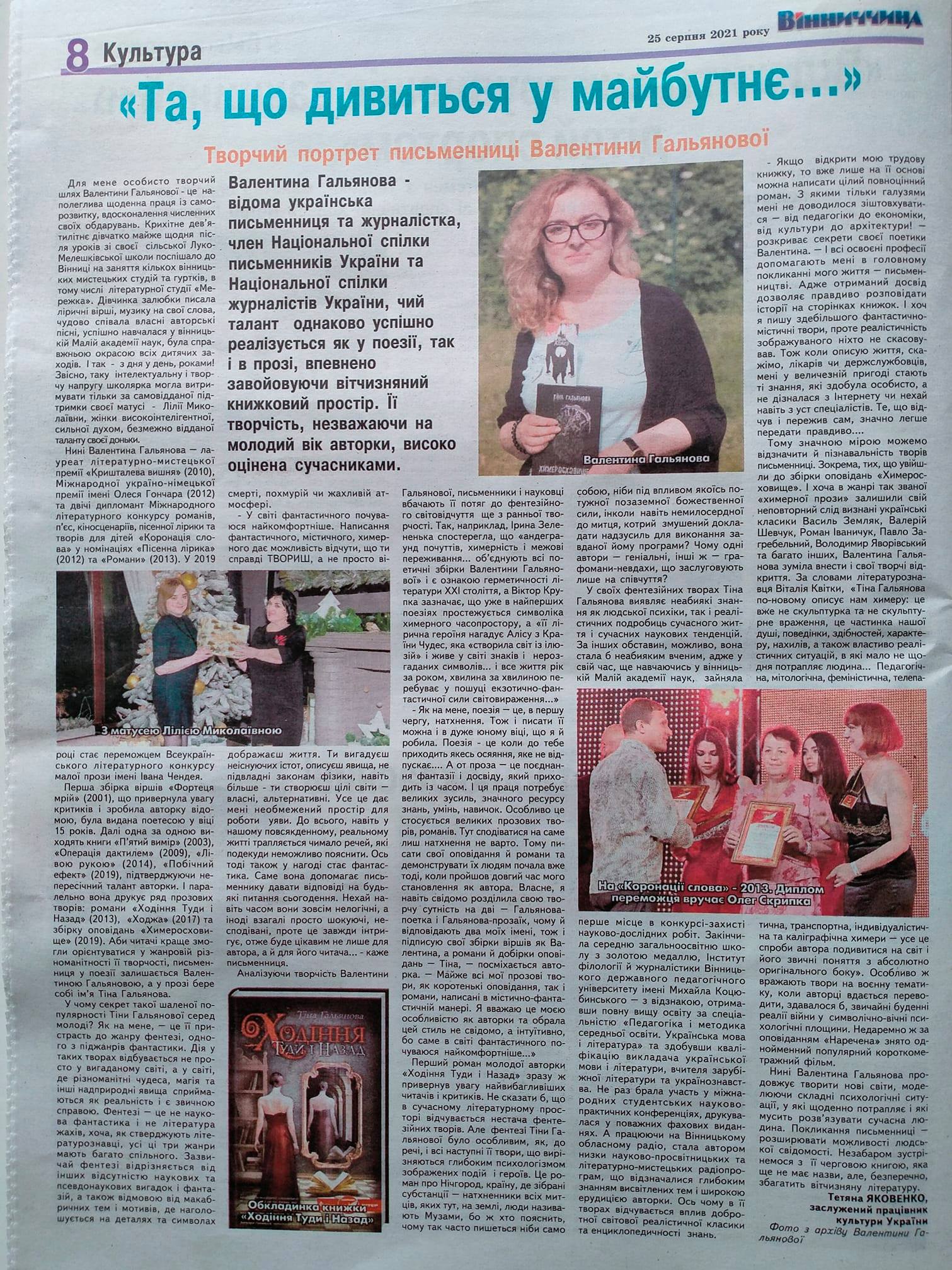 Т. Яковенко. «Та, що дивиться у майбутнє…» [Творчий портрет письменниці Валентини Гальянової] //газета «Вінниччина». – 2021. – 25 серпня.