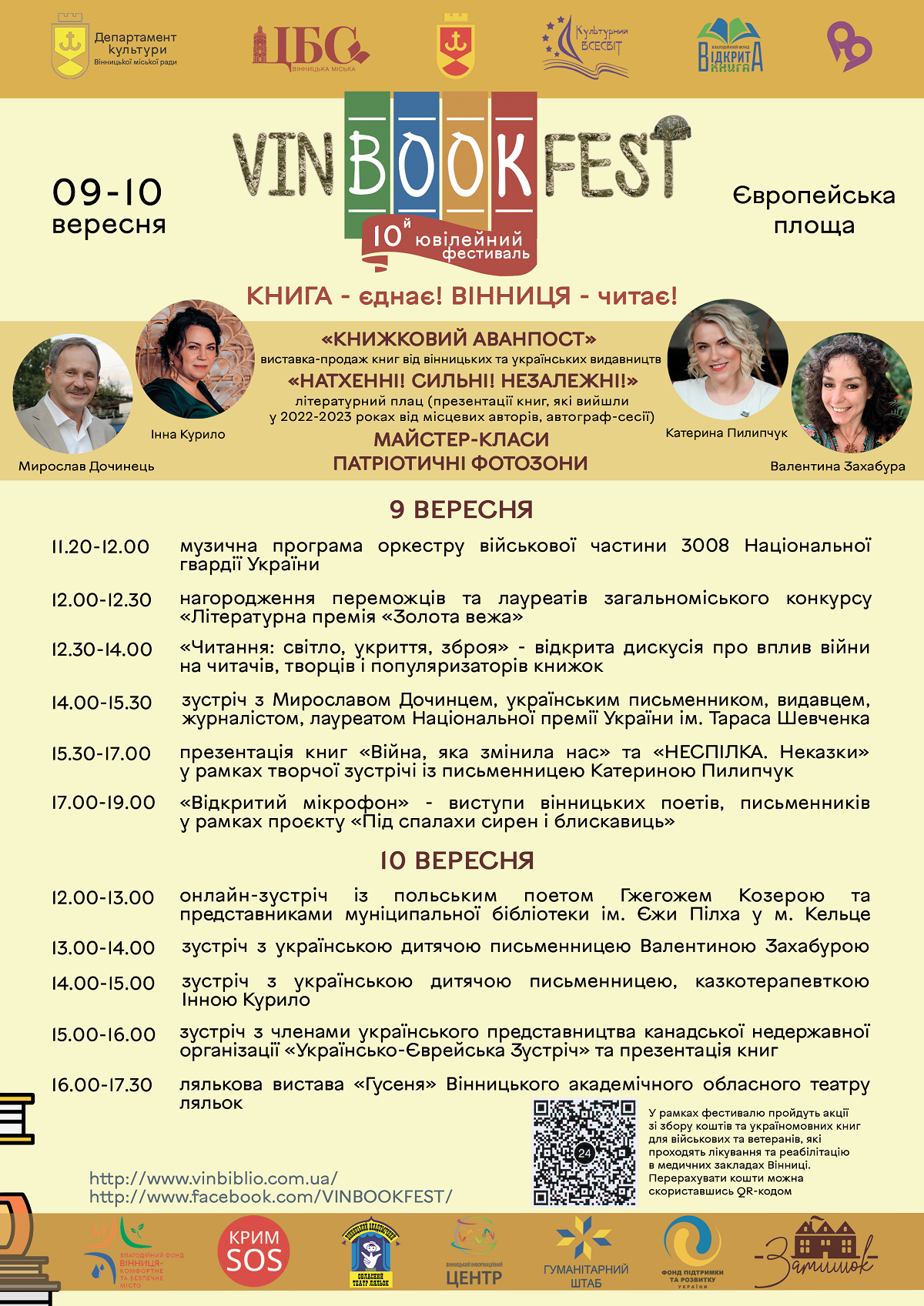 9–10 вересня 2023 р. за підтримки Вінницької міської ради, міського голови Сергія Моргунова, за сприяння Департаменту культури, Департаменту маркетингу міста та туризму Вінницька міська централізована бібліотечна система, ГО «Культурний Всесвіт», БФ «Відкрита книга» організовали та провели Х ювілейний фестиваль «VinBookFest» у межах відзначення 660-ї річниці з часу заснування Вінниці та Дня міста. Фахівці ВДПУ ім. М. Коцюбинського, НСПУ максимально долучилися до заходів, працювали на всіх майданчиках. Особлива подяка тим, хто встигає боронити наш край, волонтерити та писати вірші. Разом. І все буде Україна!