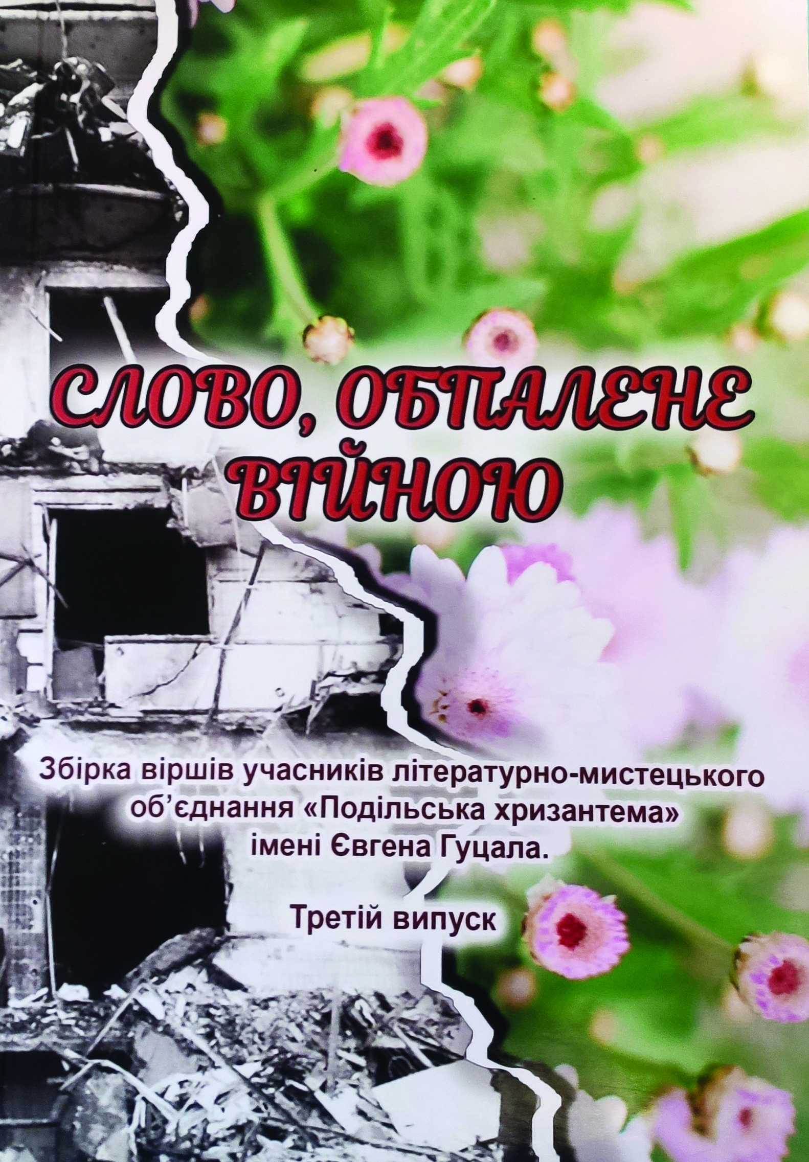 Альманах Слово обпалене війною_2022_обкладинкаСлово, обпалене війною. Збірка віршів учасників літературно-мистецького об’єднання «»Подільська хризантема імені Євгена Гуцала. Третій випуск. / Упорядники Вероніка Остапчук, Світлана Котляр. Літературний редактор Світлана Травнева. – Вінниця: ФОП Рогальська І. В., 2022. – 100 с. – ISBN 978-617-8028-12-1.