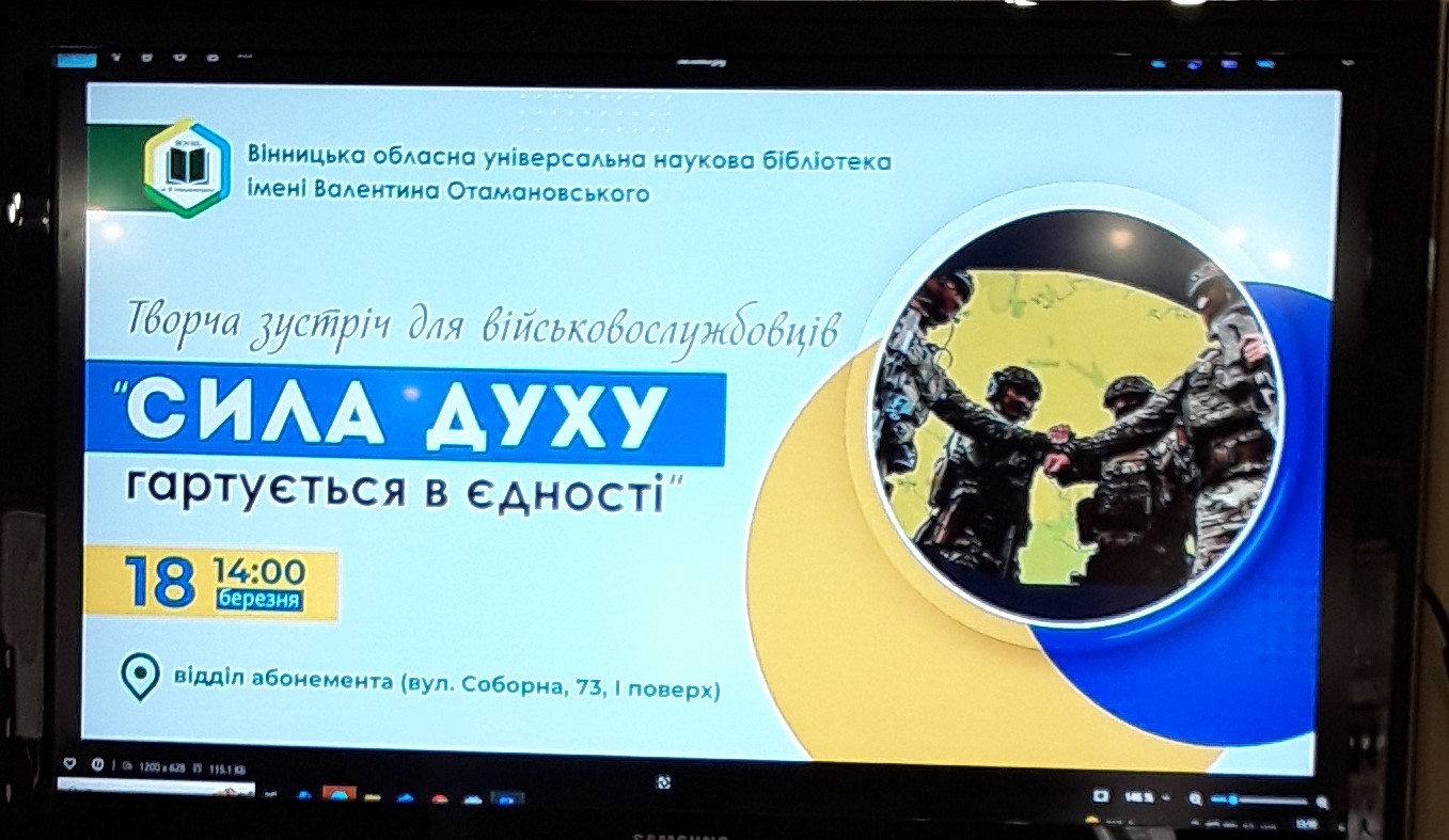 18 березня 2025 року. «СИЛА ДУХУ ГАРТУЄТЬСЯ В ЄДНОСТІ» – таку назву мала творча зустріч вінницьких письменників з військовослужбовцями, яка відбулася сьогодні в обласній науковій бібліотеці імені В.Отамановського. В ній взяли участь директор і редактор Видавничого Дому ВАДИМ ВІТКОВСЬКИЙ та МИХАЙЛО КАМЕНЮК, а також наш автор, поет ОЛЕГ КРУШЕЛЬНИЦЬКИЙ.В абонементній залі бібліотеки, де проходила зустріч (модератор ІНГА ШЕЙКІНА), було розгорнуто тематичну книжкову виставку книг на тему патріотики. В.Вітковський та М.Каменюк презентували книги-новинки ВОКУ «Моя Вінниччина», які висвітлюють героїку боротьби вінничан на передньому краї війни проти російських агресорів, розповіли про подвиги, незвичайні, цікаві, зворушливі, трагічні долі їх героїв, поділилися видавничими планами.